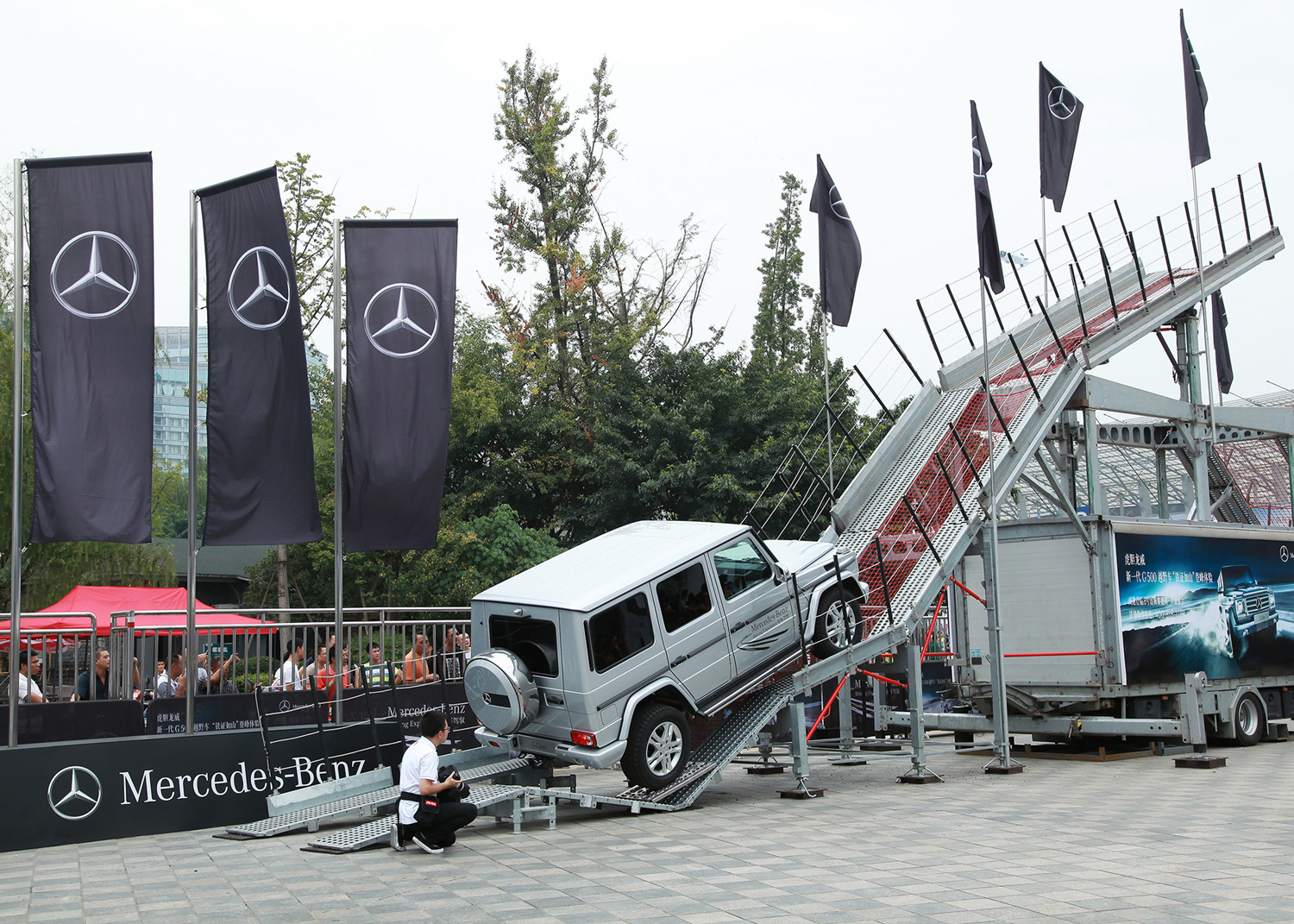 在高达6米的钢铁庞然大物上,一辆G 500此刻稳稳地屹立于巅峰之处。不管是它所在的高度,亦或是此时的车身姿态,都令人在捏着一把冷汗之余,不禁疑惑:它是怎样做到的?同时派生出来的另一个问题是:这是否是一种静态展示?擦亮眼!这是梅赛德斯-奔驰G级越野车在用真本领向世人再一次展现其依旧称霸地球的“硬汉高度”。