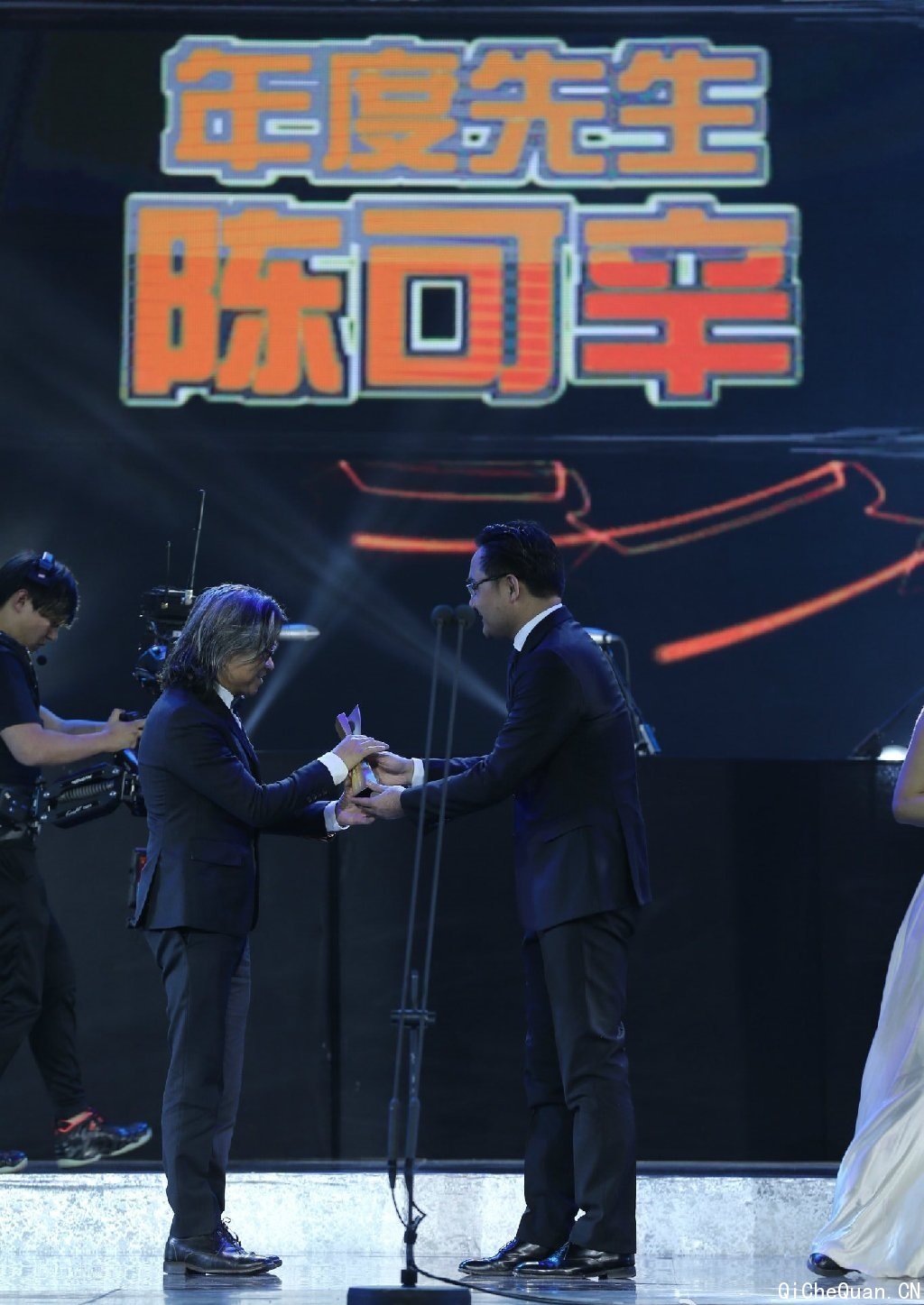 宝马(中国)汽车贸易有限公司售后服务副总裁康波先生为斩获本届年度先生奖的著名导演陈可辛颁奖