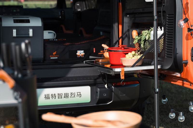 针对这一痛点,福特智趣烈马为用户提供户外烹饪的解决方案。为了打造移动“山野厨房”,福特智趣烈马在尾门集成了“切配 + 烹饪”双分区承重桌板。桌板可承重18kg,一边可以切配菜品,另一边可嵌入电磁炉实现烹煮功能。