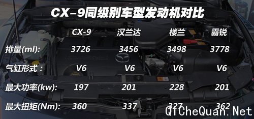 CX-9所配备的这台3.7L V6发动机,是马自达在华车型中排量最大的发动机。这台发动机用于驱动CX-9这个大家伙完全够用,驾驶中你可以明显感受到动力在源源不断的涌上来,澎湃的提速能力让CX-9的加速反应异常灵敏,V6发动机所发出的悦耳声浪,也会让你在提速时可以感受到十足的运动气息。