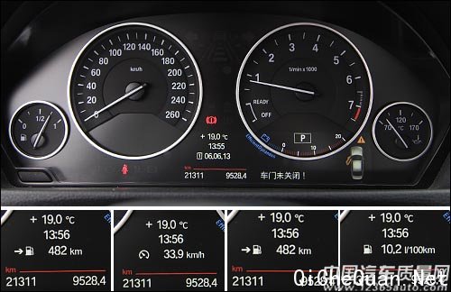 新宝马328Li的仪表增添了不少的亮点,整个仪表采用了深底色、白色指针及刻度,配以镀铬装饰尽显豪华庄重之感。“两大两小”的设计让人一目了然,而转速表并没有传统的0位,取而代之的是ready及stop,这是为了迎合车辆发动机的启停功能。此外,还设有电瓶电量的液晶显示屏,在ECO经济模式下将可以显示能量状态,这样的设计简单易懂。中间显示屏可以通过手柄按键,对续航里程、行驶里程、平均油耗等功能进行切换。不光如此,最让人眼前一亮的,是抬头显示功能。时速显示被投影在前挡风玻璃上,便于驾驶时对车速的控制,以免不知不觉中超速,这一功能非常的实用。